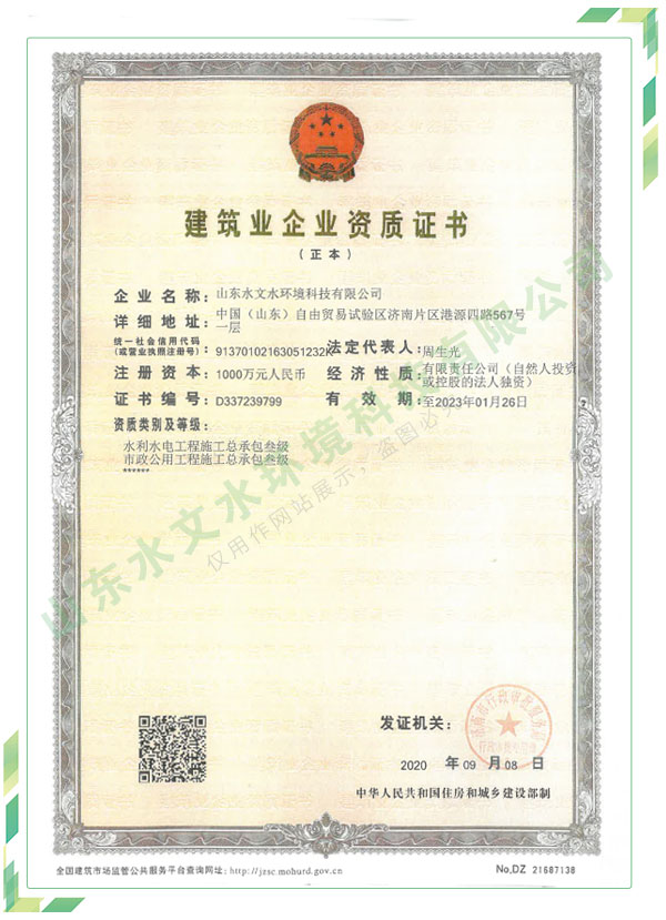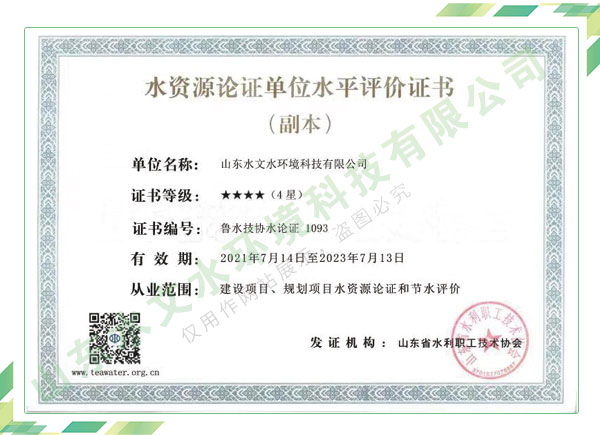 公司擁有水利工程設(shè)計(jì)、水土保持、水文水資源調(diào)查評(píng)價(jià)、水資源論證、建設(shè)項(xiàng)目環(huán)境影響評(píng)價(jià)、市政公用工程施工總承包、水利水電工程施工總承包、電子與智能化工程專(zhuān)業(yè)承包等資質(zhì),2017年通過(guò)質(zhì)量管理體系、環(huán)境管理體系、職業(yè)健康安全管理體系認(rèn)證;2020年被評(píng)為國(guó)家級(jí)高新技術(shù)企業(yè),同年被中國(guó)水利企業(yè)協(xié)會(huì)推薦為第一批“合同節(jié)水服務(wù)企業(yè)”;2021年被山東省、濟(jì)南市評(píng)為 “專(zhuān)精特新”中小企業(yè)。業(yè)務(wù)范圍涉及水利工程設(shè)計(jì);節(jié)水設(shè)計(jì)、改造、水平衡測(cè)試;山洪災(zāi)害調(diào)查;城市水資源調(diào)查評(píng)價(jià);建設(shè)項(xiàng)目水土保持方案編制、監(jiān)測(cè)、驗(yàn)收、水土保持規(guī)劃;水安全保障規(guī)劃、建設(shè)項(xiàng)目水資源論證、規(guī)劃水資源論證;建設(shè)項(xiàng)目環(huán)境影響評(píng)價(jià);入河排污口論證;防洪影響評(píng)價(jià);市政公用工程施工、水利水電工程施工、電子與智能化工程施工等。